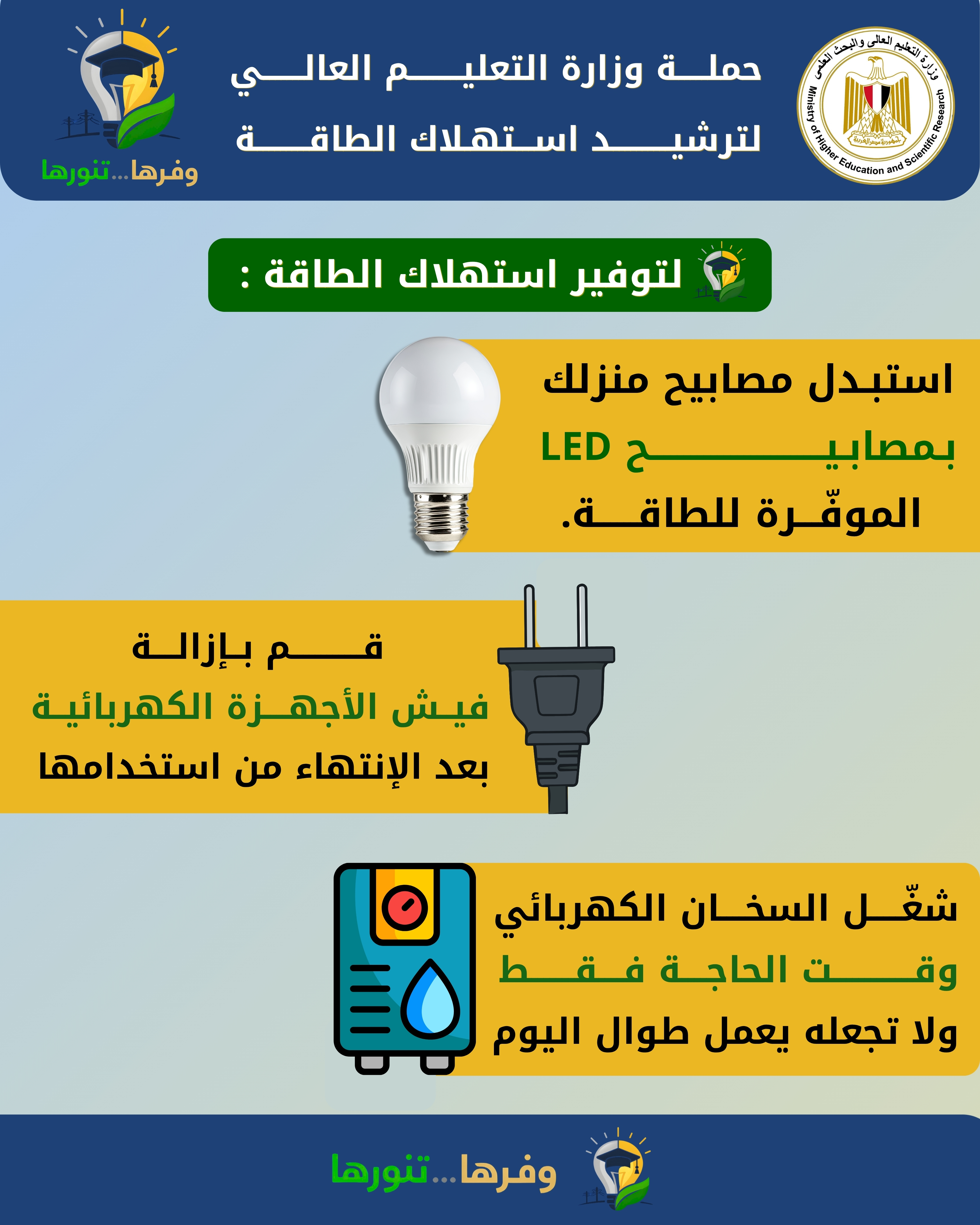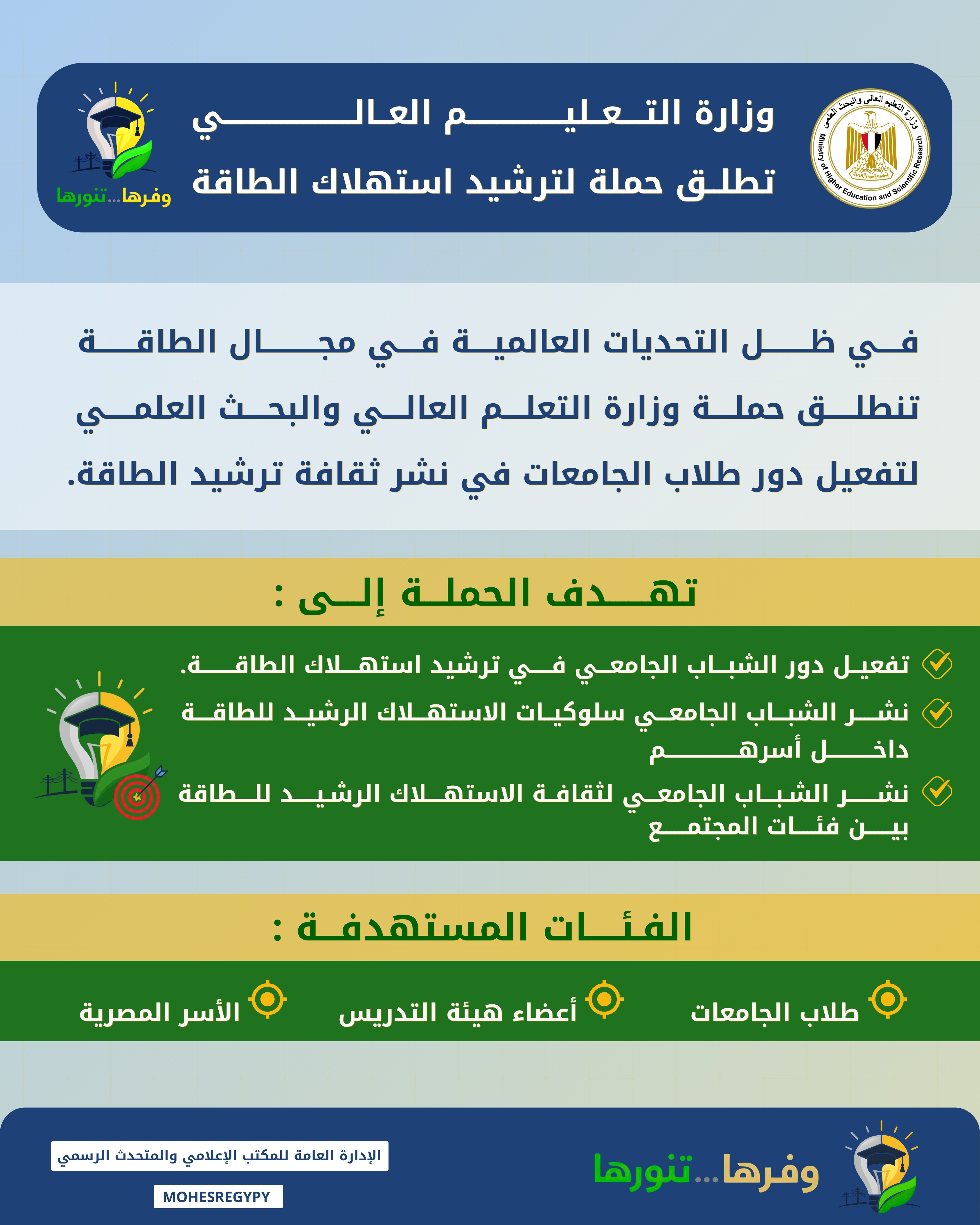 - في إطار توجيهات وزارة التعليم العالي ومواكبة التحديات العالمية، تُطلق حملة لتعزيز دور طلاب الجامعات في ترشيد استهلاك الطاقة.