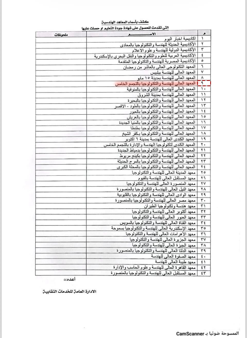 رقم المعهد بالجدول رقم(٩)، والصادر من نقابة المهندسين المصريه بتاريخ ٢٠٢٣/١٢/١٦، وعقبال الاعتماد .